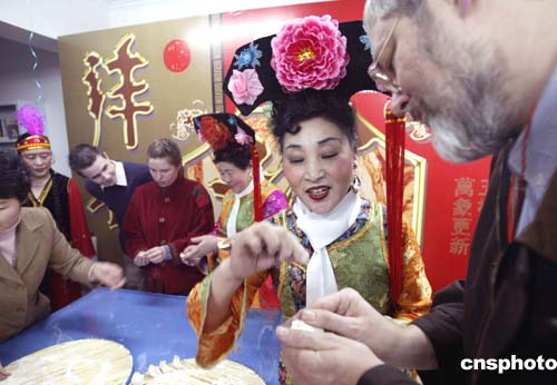 二月八日是中國傳統的除夕之夜,來自法國、英國等國家的六十余位外國友人在北京朝陽麥子店街道社區度過了一個極富中國傳統民俗特色的除夕之夜,他們與社區居民一同看演出、品嘗中國傳統美食、對對聯、學做中國手工水餃。作者:任海霞