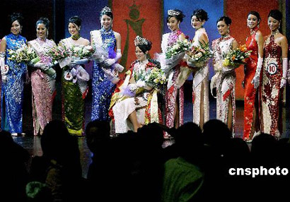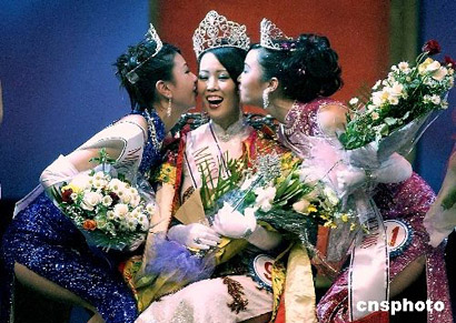 當(dāng)?shù)貢r(shí)間二月十一日,第四十八屆全美華埠小姐競(jìng)選在加州舊金山舉行。現(xiàn)年二十二歲、自達(dá)拉斯市的福建籍女孩陳盈璉(圖一,中)當(dāng)選二00五年全美華埠小姐。圖二為當(dāng)選中華總商會(huì)小姐的王曉玲(右)和當(dāng)選舊金山華埠小姐的王穎(左)親吻陳盈璉表示祝賀。 作者:陳鋼