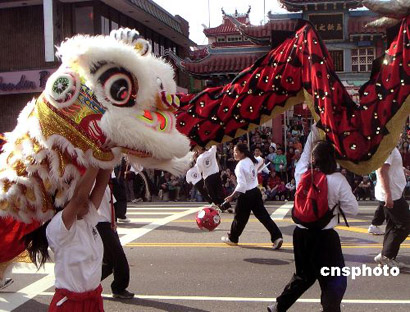 美國洛杉磯華埠二月十二日舉行第一百零六屆金龍大游行。圖一為賀歲彩車駛過唐人街,向華洋民眾祝賀中國農歷雞年新春佳節的到來。圖二為華人和各種族民眾共同歡慶中國農歷雞年。圖三為廣東潮州會館的金雞仙女彩車,為美國洛杉磯華埠二月十二日舉行的一百零六屆傳統金龍大游行錦上添花。 作者:賈國榮