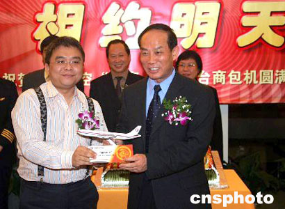 圖為東航總經理羅朝庚(右)在向臺胞“幸運乘客”頒發免費機票。作者:潘索菲