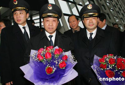圖為機組人員在機場受到熱烈歡迎。作者:潘索菲