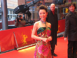 張靜初在《孔雀》首映,以一襲中式繡片禮服現身,她身上的繡片有上百年的歷史,十分迷人。柏林天寒地凍,張靜初以無袖禮服和柏林影展主席狄亞特柯斯利克又戴幅又穿厚大衣,形成紅地毯上的有趣對比。