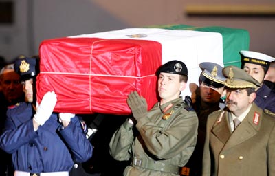 中新網3月7日電 綜合消息,被駐伊美軍射殺的意大利特工遺體3月6日已運返羅馬,總統及總理到機場向覆蓋國旗的棺木致敬。51歲的特工卡利巴里為了保護獲武裝分子釋放的意大利女記者斯格雷納,中彈身亡。意大利政府3月7日將為他舉行國葬。