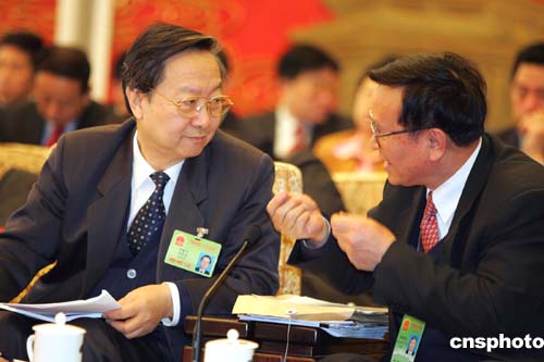 國家安全生產監督管理總局局長李毅中(左),三月七日到全國人大遼寧代表團參加審議政府工作報告,聽取該團代表關于安全生產問題的發言。作者:湯彥俊