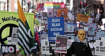 反戰人士以“讓我們的軍隊回家”為口號,抗議布萊爾政府兩年前派軍隊入侵伊拉克,并要求英國軍隊立即從伊拉克撤軍。倫敦市長利文斯通和曾被美國政府關押在美軍關塔那摩基地的英國人穆班加向示威民眾發表了演講。示威者還前往美國大使館前抗議。