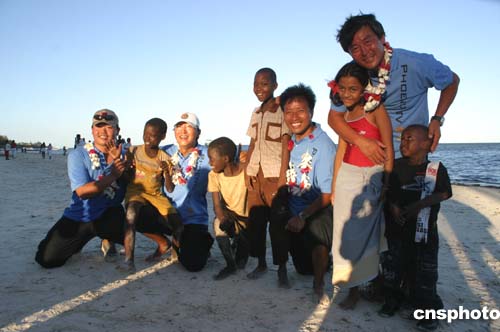 香港鳳凰衛(wèi)視“鳳凰號”單桅帆船完成鄭和下西洋航程十六日抵達肯尼亞蒙巴薩港,圖為“鳳凰號”隊員們十九日與肯尼亞兒童在一起。作者:邢健