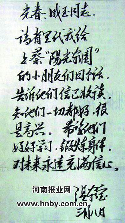 3月8日,溫總理收到來(lái)信后,欣喜地在信上批示:“光春、成玉同志:請(qǐng)省里代我給上蔡‘陽(yáng)光家園’的小朋友們回個(gè)話(huà),告訴他們信已收讀,知他們一切都好,很是高興。希望他們好好學(xué)習(xí),鍛煉身體,對(duì)未來(lái)永遠(yuǎn)充滿(mǎn)信心。”