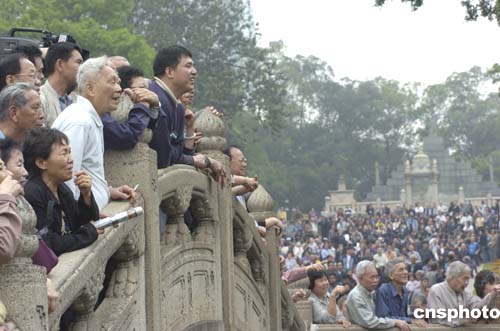 祭奠完畢,江丙坤與隨行成員登上七十二烈士紀(jì)功坊,輕輕撫摩著碑坊、細(xì)細(xì)閱讀著七十二烈士的英勇事跡。期間,江丙坤兩度回首,向坊下瞻望的民眾揮手致意,大家則報(bào)以熱烈的掌聲和問(wèn)候聲。