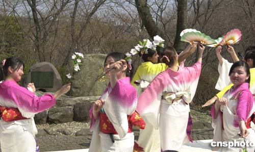 | 日本創(chuàng)價大學(xué)校園內(nèi)三日舉行傳統(tǒng)的“周櫻”觀賞會。三十年前,在創(chuàng)價學(xué)會會長池田大作的提議下,首批留學(xué)創(chuàng)價大學(xué)的六名中國留學(xué)生種植櫻花樹苗,被命名為“周櫻”。此后,每年春暖花開時節(jié)的“周櫻”觀賞會,便成為此間日本友人緬懷周恩來的一項傳統(tǒng)活動。圖為在“周櫻”紀(jì)念碑前,創(chuàng)價大學(xué)學(xué)生手持櫻花翩翩起舞。作者:王健