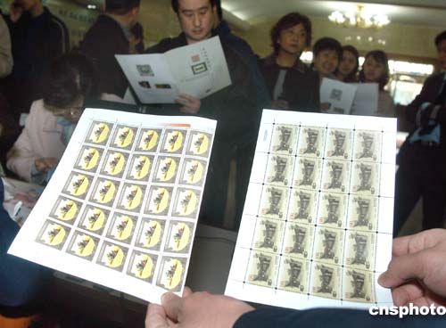 四月五日,新中國第一套地方版印花稅票《北京印花稅票之一北京胡同》在北京市各區縣地稅局向社會發售。此套印花稅票有九種面值,由北京市地方稅務局發行、國家郵政局郵票印制局印制,極具收藏價值。圖為北京市東城區地稅局工作人員展示新舊兩版印花稅票,圖右為新版印花稅票。作者:張宇