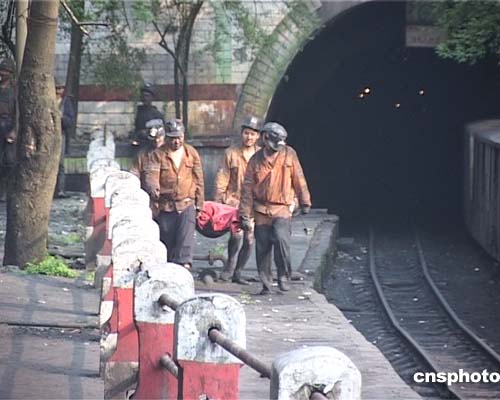 四月五日下午二時十五分,位于重慶市合川境內的天府礦業公司三匯一礦發生煤與瓦斯突出特大事故,目前有一人遇難,二十二人生死不明。圖為遇難礦工尸體被抬出井口。作者:郭晉嘉