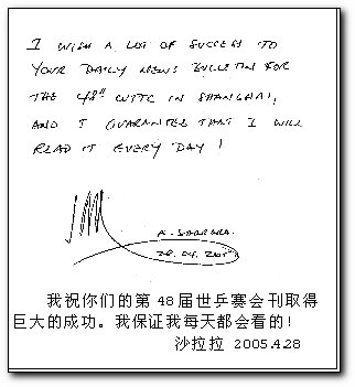 “兩周前當我來到上海,我所看到的一切告訴我,上海為這屆世乒賽作了充分的準備。三天前我再次走下飛機,一路上到處是彩旗、海報、宣傳廣告,我看到了布置一新的主、副場館,感受到親切的接待服務。我還聽說人們熱情高漲,幾乎所有的球票都賣完了。這使我更加確信,上海已經完全準備好了。”國際乒聯主席沙拉拉昨天在接受本報記者專訪時,再一次對上海的世乒賽組織工作豎起大拇指。