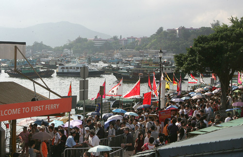 中新網(wǎng)5月16日電 據(jù)香港大公報(bào)報(bào)道,一年一度的香港長(zhǎng)洲太平清醮會(huì)景飄色巡游昨日舉行,由于停辦了二十六年的“搶包山”活動(dòng)今年復(fù)辦,令原來(lái)已很熱鬧的小島變得更熱鬧。今次飄色巡游有十多隊(duì)參加,每隊(duì)都有不同主題。據(jù)估計(jì),活動(dòng)吸引超過(guò)二萬(wàn)人參與,其中由兩名小朋友扮演的曾蔭權(quán)和董建華最神似。