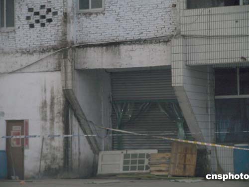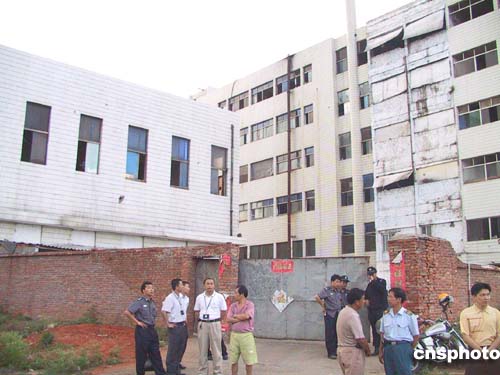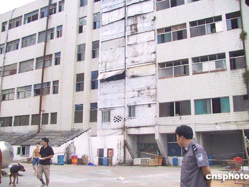工廠由兩幢半拉子樓組成,樓房顯得很陳舊,一些窗戶甚至沒有玻璃,黑洞洞地呲著嘴。正對院門的大樓據說是生產車間,高六層。大樓中間是電梯井房,但沒有安裝電梯。廢棄的電梯井房便被工廠當作生產浸泡水池。一樓電梯井口的鐵制卷閘門被嚴密地拉下,前面還擋了一塊門板和一條警戒線。