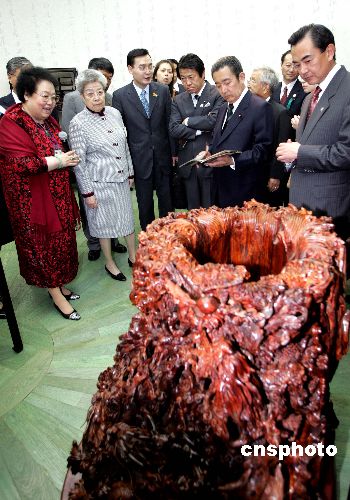 | 五月十九日,二零零五年日本愛知世屆博覽會中國館日活動隆重舉行。中國國務(wù)院副總理吳儀(左二)出席,并與日本前首相橋本龍?zhí)?右二)等貴賓一起參觀中國館內(nèi)的紫檀齋。二零零五年日本愛知世博會中國館主題為“自然、城市、和諧--生活的藝術(shù)”,中國館的展出通過博大精深的中國文化的演繹,表達(dá)了中國人“天人合一”的哲學(xué)思想。圖為中國紫檀博物館館長陳麗華(左一)向來賓介紹精湛的紫檀工藝品。作者:毛建軍
