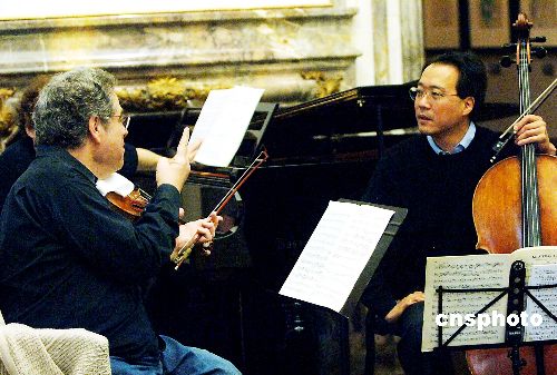 5月25日,世界著名大提琴家馬友友和小提琴家伊扎克·帕爾曼在紐約一起排練。他們將在帕爾曼音樂培訓(xùn)班學(xué)生畢業(yè)典禮上同臺(tái)獻(xiàn)藝,屆時(shí)備受期待的兩位樂壇巨擘的合作,將給世界樂迷們帶來美妙享受。作者:Ic/cnsphoto
