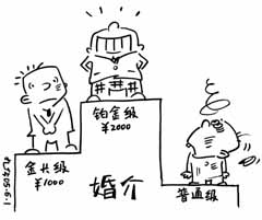 最近,南京出現(xiàn)一家“貴族婚介”,這家機構(gòu)將會員分成三個級別。首先是鉑金級,要求男性月收入在5000元以上,身高在1.75米以上,學歷本科以上,相貌端正談吐得體;女性月收入在3000元以上,身高在1.65米以上,學歷本科以上,漂亮。這個級別的會員年費為2000元。其次是金卡,要求男性月收入在3000元,身高難1.72米,本科;女性月收入1500元,身高1.62米,大專。這個級別的年費是1000元。最后是普通止背,不管男女,只要求收入在1000以上。按照規(guī)則,“上級”會員可以查看并約見“平級”和“下級”會員,“下級”會員去不能約見“上級”會員。這家“貴族婚介”的人員介紹,他們之所以將會員分級,目的只是想提高成功率。“我們并不是阻礙自由戀愛,但既然大家求助于婚介,借助一些社會上的潛規(guī)則有利于提高成功率。”