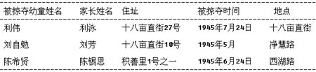 官麗珍根據在廣州市檔案館查閱的檔案,在書中列舉了檔案中記載的三名中國幼童的姓名、家長姓名、地址、被掠奪時間和地點(詳見左表)。這些兒童都是在廣州市警察局轄內被日軍掠走的。官麗珍認為,當年日軍擄掠殘殺兒童是常事,但一次性掠走這么多兒童,比較典型。她同時表示,日軍劫掠兒童雖是在日本投降之前,但很難證明日軍意識到要投降才大肆捕捉,為戰后青壯年補充之用。因為日本天皇不說戰敗,日軍也許還認為自身形勢不錯。