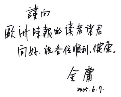 在見面會(huì)后,金庸欣然接受了歐洲時(shí)報(bào)的專訪,并給該報(bào)報(bào)題詞向讀者問好:“謹(jǐn)向歐洲時(shí)報(bào)的讀者諸君問好,祝各位順利、健康。”