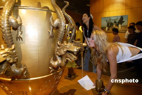 六月十一日,參加二零零五國際旅游小姐冠軍總決賽的來自七十五個國家和地區的佳麗,來到河南省鄭州市,開始河南巡游之旅,暢游美麗中原,感受黃河風情,體驗悠久歷史。圖為鄭州河南博物院根據歷史記載復原的地動儀吸引參賽佳麗。作者:盛佳鵬