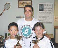中新網6月13日電 據世界日報報道,華裔兒童莫小虎(前左)日前參加美國網球協會于紐約布魯克林舉行的美東區冠軍賽,獲得10歲組冠軍,圖為莫小虎與第二名的柯恩(前右)獲獎后與教練合影。(《世界日報》梁起華)