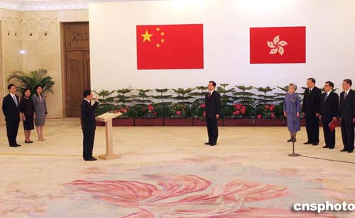 中新網6月24日電 香港特別行政區行政長官曾蔭權宣誓就職儀式今天上午在人民大會堂香港廳舉行。