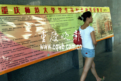 重慶師范大學(xué)學(xué)生處張老師介紹,《管理規(guī)定》是嚴(yán)格遵守重慶市教委《高等學(xué)校制定和修改學(xué)生管理制度》中第四十二條“有損大學(xué)生形象、有損社會(huì)公德”的精神來(lái)修訂的,于5月22日正式試行,6月中旬制成展板,放到學(xué)生出入較多的一教樓,希望學(xué)生發(fā)表自己的看法。但是,直到昨日,沒(méi)有一個(gè)學(xué)生到學(xué)生處反饋意見(jiàn)。