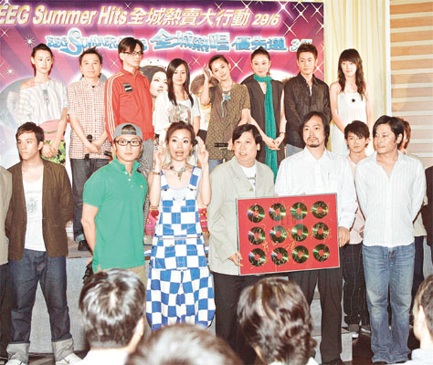 為挽救低迷唱片市道,英皇昨安排旗下歌手容祖兒、謝霆鋒、Twins、鄭希怡、達(dá)明一派、梁洛施、關(guān)智斌、Boy'z等齊集“1212+”餐廳出席記者會(huì),宣布將于暑假發(fā)起連串大型宣傳,包括Twins于七月一日踩入旺角,而七月三日英皇全體歌手將在九龍灣國(guó)際展貿(mào)中心舉行音樂會(huì)。