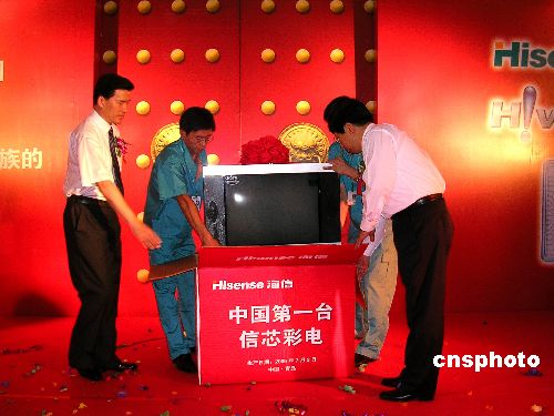 今天在此間海信集團研發中心舉行的儀式上,青島市市長夏耕和海信集團董事長周厚健為第一臺下線的裝有“信芯”的海信高清彩電封箱。隨后,青島市副市長吳經建代表市政府宣布,獎勵海信研發團隊二百萬元人民幣。海信集團也表示把首批一百臺“信芯”彩電捐贈給分布在西部地區的三十所海信希望小學。