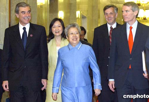 中國國務院副總理吳儀與美國商務部長古鐵雷斯進行會談。作者:廖文靜