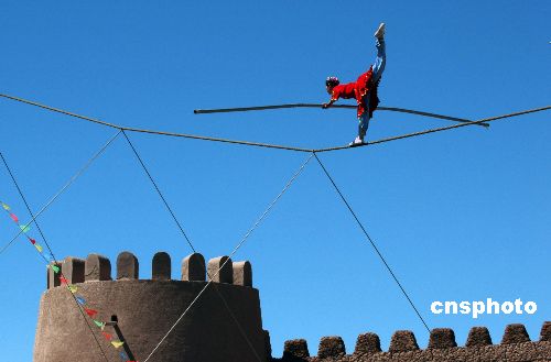 “達瓦孜”維吾爾語的意思是高空走大繩,古稱“走索”,是新疆維吾爾族傳統的民間雜技表演藝術,源于兩千多年前的西域,據說在新疆也只有一個家族從事這項表演,多次創造吉尼斯世界紀錄的著名藝術家阿迪力就出生于新疆喀什地區英吉沙縣,是達瓦孜傳人。圖為在喀什維吾爾民族風情園中表演達瓦孜的十二歲小姑娘,正在約三十米高的繩索上展示單腿平衡絕技。作者:田地