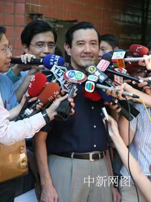 7月16日,中國國民黨主席選舉在全臺601個投票所展開。圖為1號參選人、臺北市長馬英九在居家附近的臺北興德小學參加投票前,接受記者采訪。中新社記者 董會峰