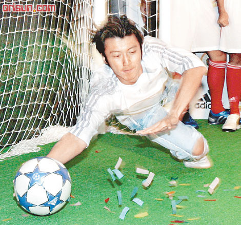 除了做守門員外,霆鋒還和港隊(duì)球員一同切磋控球技術(shù),相比起一班專業(yè)港隊(duì)球員,霆鋒表現(xiàn)總算不過(guò)不失,他表示:“我手同腳都未好,加上我其實(shí)不會(huì)踢球,一年都是踢一兩次,頭球射龍門真是好難擋,因?yàn)檎媸呛每臁!?/p>