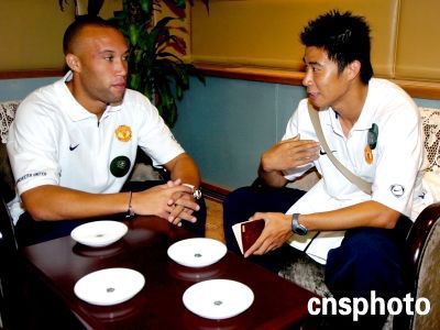 英超豪門曼聯隊昨日抵達北京,開始他們的中國之行。在未來的幾天中,他們將與中國的球迷以及媒體見面,并將與北京現代隊進行一場友誼賽。圖為中國球員董方卓與法國球星西爾維斯特交談。