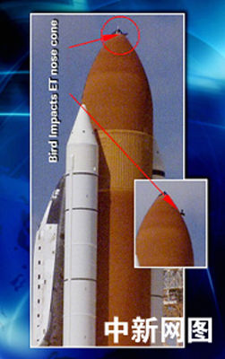 7月26日,美國“發現號”航天飛機從肯尼迪航天中心發射升空時,一只鳥在發射場附近飛過。當天下午的新聞發布會上,美國宇航局提供的一幅電視圖片顯示,一只鳥可能在“發現號”航天飛機發射的時候撞擊了燃料箱的最前端部分。與此同時,美國宇航局證實,在26日的發射升空過程中,“發現號”上脫落下來一小塊隔熱瓦和一大塊碎片。“發現號”底部擋熱板可能有兩處遭到了破壞。
