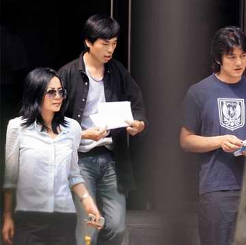 王菲扎著馬尾,穿一件黑色T恤和一條時(shí)尚的乞丐牛仔褲,戴一副超大號(hào)的黑色墨鏡,李亞鵬穿米黃色短袖襯衣、休閑褲。從兩人下車(chē)一直到在結(jié)婚登記處辦完手續(xù),李亞偉不離左右,而穿淺藍(lán)色T恤的男士則用DV機(jī)進(jìn)行跟拍。