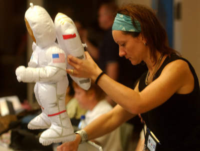 一位美國女記者期待發現號首次太空行走成功,特意舉起一個準備太空行走的宇航員卡通人,放在電腦前。