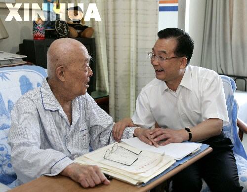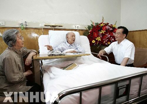 “十五六年前,我就和您在一起共事。”坐在病榻旁,溫家寶深情地說,“我昨天翻看了一下當年的日記本。15年前,我到您辦公室談科技工作,還有您的幾句話記在本子上。您說,社會是一個大系統工程,不僅要有物質文明、精神文明,還要有政治文明。另外,您還講應該有個地理系統。您還記得吧?那一天是7月3日。”