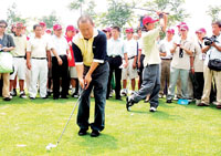 曾志偉是昨天一早先于明星隊伍到達現場的。前段時間一直坐在輪椅上的他已經可以一瘸一拐地下地走路了,而且堅持不讓別人攙扶,總算順利打出了漂亮的第一桿。