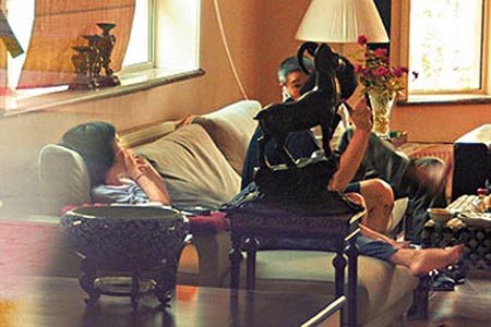 第二日,王菲與李亞鵬在第二日下午四時先起身,穿住T恤長褲,人字拖的王菲,與短衫短褲的李亞鵬由二樓睡房下到地下客廳,懶慵慵身貼身“攤”在巨型梳化上,“腳印印”看電視送“早餐”。由于二人婚前已同居一段時間,所以感覺相當老夫老妻。當發現有記者拍照時,王菲反應相當敏捷,即時通知老公,并用手掩面,因不防有此一招,原本吊在她腳尖上的人字拖,亦在慌忙中飛脫落地下。