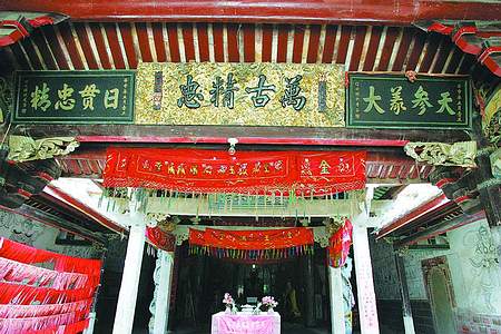 胡世成老人向記者講述鼎美與臺灣悠久淵源。正氣殿里的蟠龍柱上記載著,該殿為清代嘉慶年間重修,可見正氣殿的歷史要比清代嘉慶年更久遠得多。這座關帝廟還是海峽兩岸同胞血脈情深的歷史見證。前不久,一位在廈門投資的臺灣企業(yè)界人士盧國山先生據(jù)先輩的傳聞尋訪到鼎美的關帝廟,盧先生感到興奮的不僅是看到這古村中竟藏著這么一座建筑精巧的古關帝廟,更重要的是他親眼印證了臺灣前輩的傳聞。原來盧先生家在臺南,先輩們一代一代地傳說臺南的關帝爺來自同安的鼎美(鼎美古屬同安縣),其外觀建筑和內部的神像雕塑全部以鼎美的關帝廟為范本,今天一見果然如此。盧先生驚喜之情溢于言表。他兒時在臺南度過,關帝爺、赤兔馬、周倉、關平,這些栩栩如生的形象深深地印在他的腦海里,現(xiàn)在鼎美關帝廟所見與臺南的一模一樣。其實是先有鼎美關帝廟,后有臺南關帝廟,原來根在這里啊!特別令他有感觸的是,正氣殿門柱上一副古人撰寫的對聯(lián)“鼎室雖三分紫陽特筆終歸漢;江山未一統(tǒng)華夏知名獨有公”,期盼國家統(tǒng)一,古人今人有著同樣的愿望。