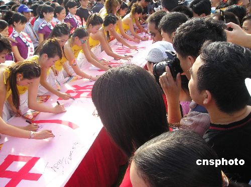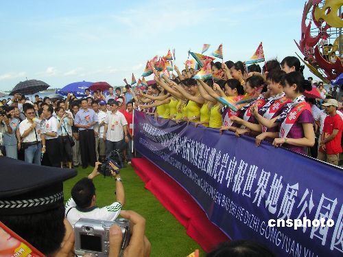 8月14日,2005年亞洲小姐(中國賽區)進入總決賽的20名候選佳麗來到廣東湛江,傾情支持該市湖光巖申報世界地質公園。作者:馬燦