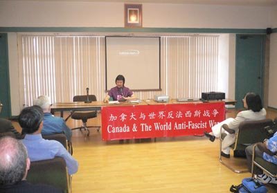 圖片展期間,中國總領館邀請有關學者和卑詩省抗日戰爭史實維護會的負責人舉辦三場抗戰史實講座,主題是《加拿大與世界反法西斯戰爭》。中新社記者呂振亞攝