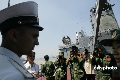 | 八月二十二日,中國(guó)部分媒體被中俄軍事演習(xí)俄軍方邀請(qǐng),參觀采訪此次參加演習(xí)的俄羅斯反潛艦,這艘停靠在青島港的艦艇正整裝待發(fā),明日將起航參加海上封鎖演習(xí)。圖為中國(guó)軍方記者對(duì)一位在艦上值勤的俄海軍軍官產(chǎn)生濃厚興趣。作者:王麗南