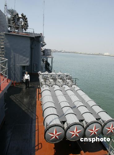八月二十二日,中國部分媒體被俄軍方邀請,參觀采訪此次參加演習的俄羅斯反潛艦,這艘停靠在青島港的艦艇正整裝待發,明日將起航參加海上封鎖演習。圖為反潛艦的一角。作者:王麗南