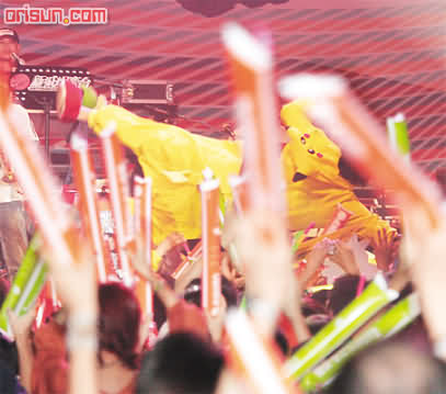 在壓軸合唱部分,達明換了睡袍造型,霆鋒不示弱,即場脫衣拋下臺,露出當年和王菲“比翼雙飛”愛的紋身,又用水淋頭,拗腰彈跳;high到震的他,然后用國語連問兩次站在臺前的大陸fans:“你們會接我嗎?”即飛身下臺,全場嘩然,霆鋒和前排觀眾跌在一堆,形成一個凹字,嚇到正在唱歌的明哥目瞪口呆,馬上叫大會:“停一停音樂。”猛問:“霆鋒有沒事?”現場燈光大,保安和助手紛紛走近察看霆鋒,隔了半分鐘,霆鋒才跳上臺,連鞋都甩開,赤腳說:“不好意思,讓大家擔心,你們有沒事?我還好,如果你們有事,我不會再在香港演出,你們真的OK?”幸沒人受傷,不致樂極生悲。