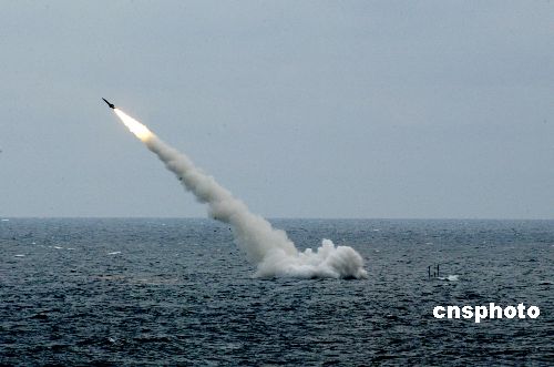 二十三日,“和平使命——2005”中俄聯合軍事演習第三階段——實施交戰的海上封鎖演練在中國黃海海域進行。圖為中國新型潛艇水下發射導彈出水瞬間。作者:王麗南
