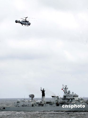 二十三日,“和平使命——2005”中俄聯合軍事演習第三階段——實施交戰的海上封鎖演練在中國黃海海域進行。圖為直升飛機釋放聲納,搜尋潛艇,與艦艇聯合反潛。作者:王麗南