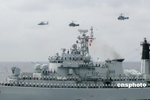 “和平使命-2005”中俄聯(lián)合軍事演習(xí)第三階段8月23日在中國(guó)山東半島及其附近海域舉行。圖為中俄艦機(jī)編隊(duì)接受聯(lián)合導(dǎo)演部檢閱時(shí),中方艦艇駛過(guò)觀摩艦時(shí)情景。作者:王麗南