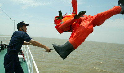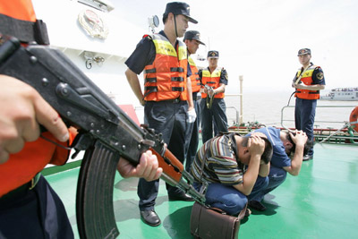 在這次演習中,靠幫和跳幫是緝私隊員著重鍛煉的兩個技術動作。“涉嫌走私船是不會乖乖聽話讓我們靠上去的!焙贾莺jP緝私局海查科長楊政說。今年1月,舟山緝私分局的一艘緝私艇在追擊一艘涉嫌走私冰凍白魚的漁船時,漁船邊逃邊擺尾,緝私艇根本無法靠船跳幫。追擊了一天一夜后,在溫州緝私分局一艘緝私艇的夾擊下才終于靠近漁船,緝私隊員在兩船起伏落差較大情況下跳幫過去,控制住了走私漁船。